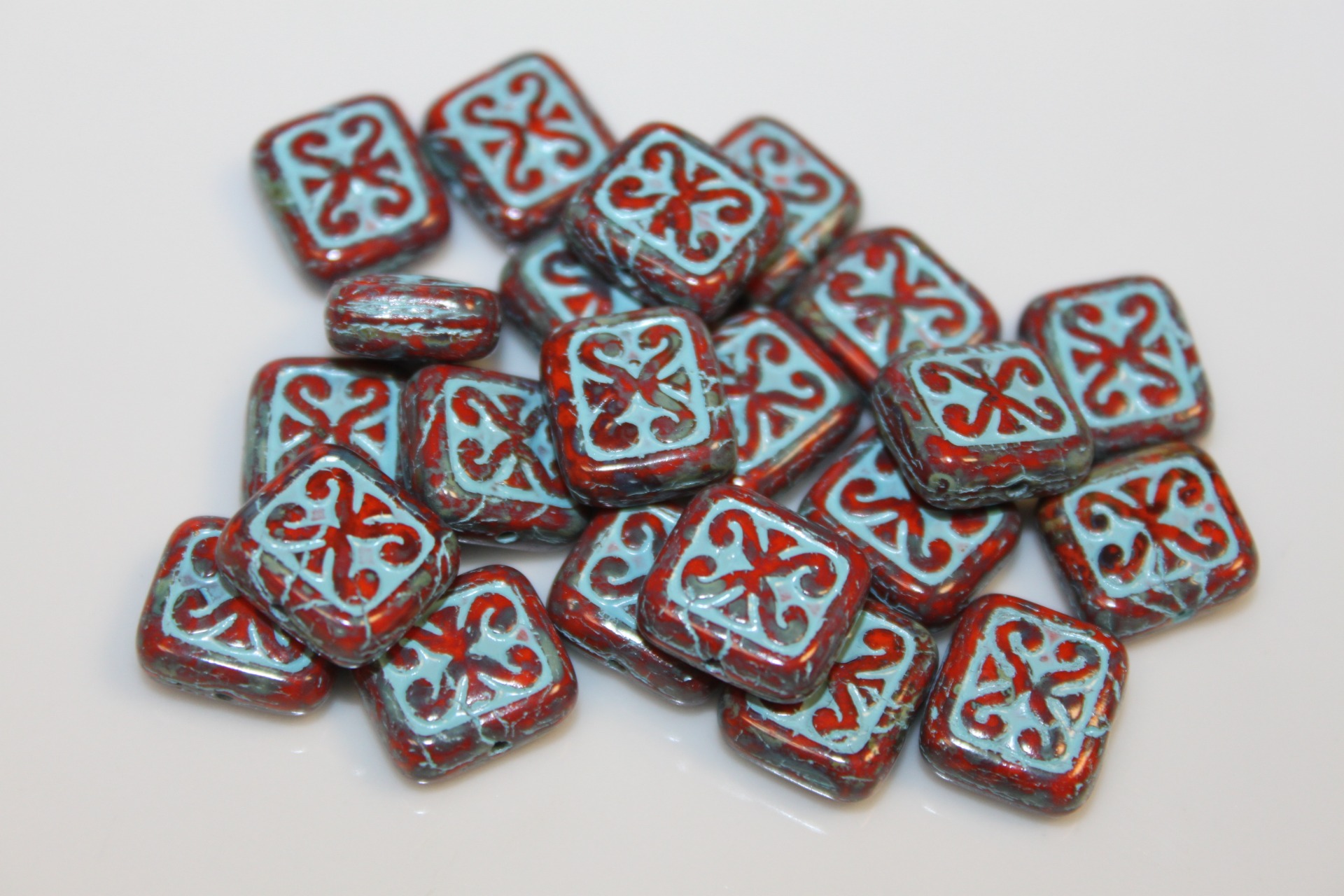 Čtverec s ornamentem - 11x12mm - červená/travertin/modrý zátěr - 10ks